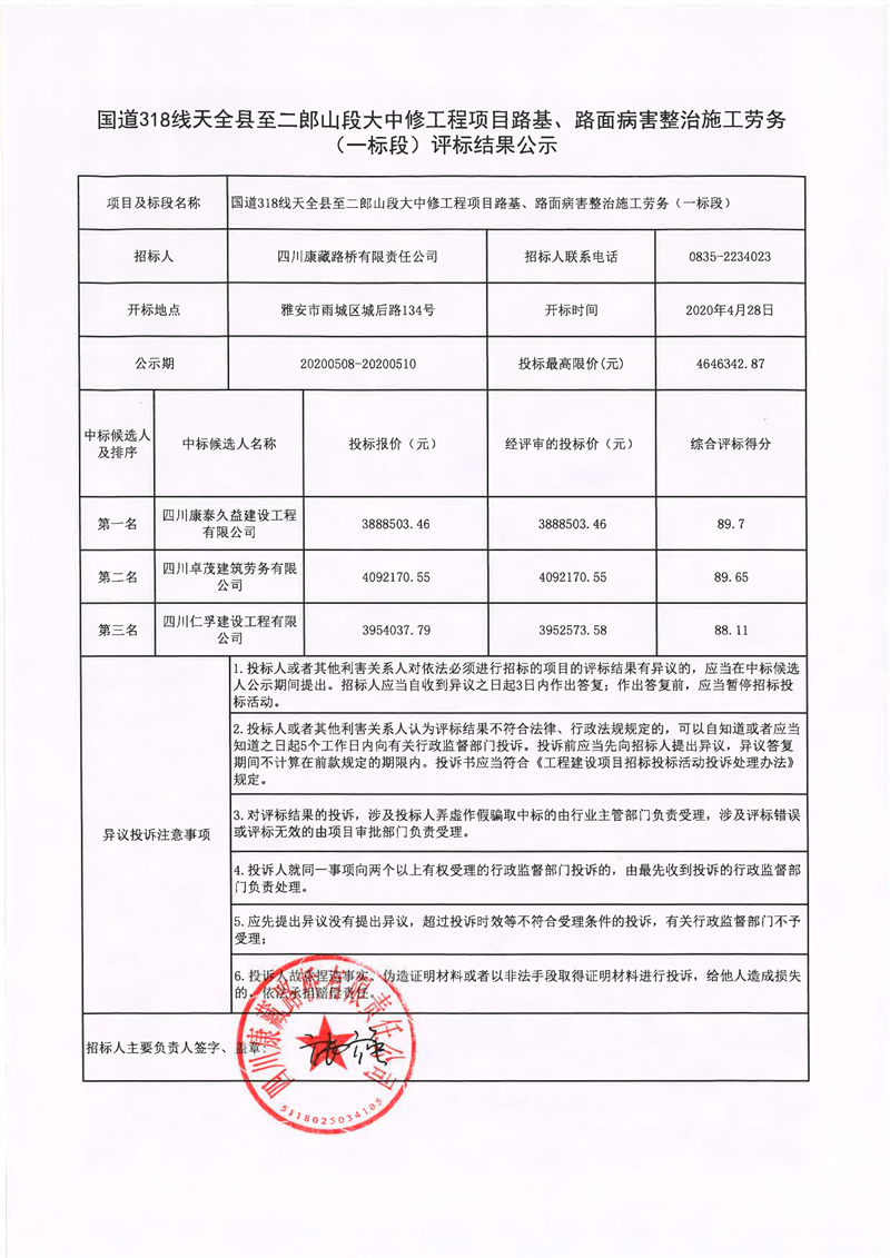 四川康藏路橋有限責任公司國道318線天全縣至二郎山段大中修工程項目路基、路面病害整治施工勞務(一標段)評標結果公示