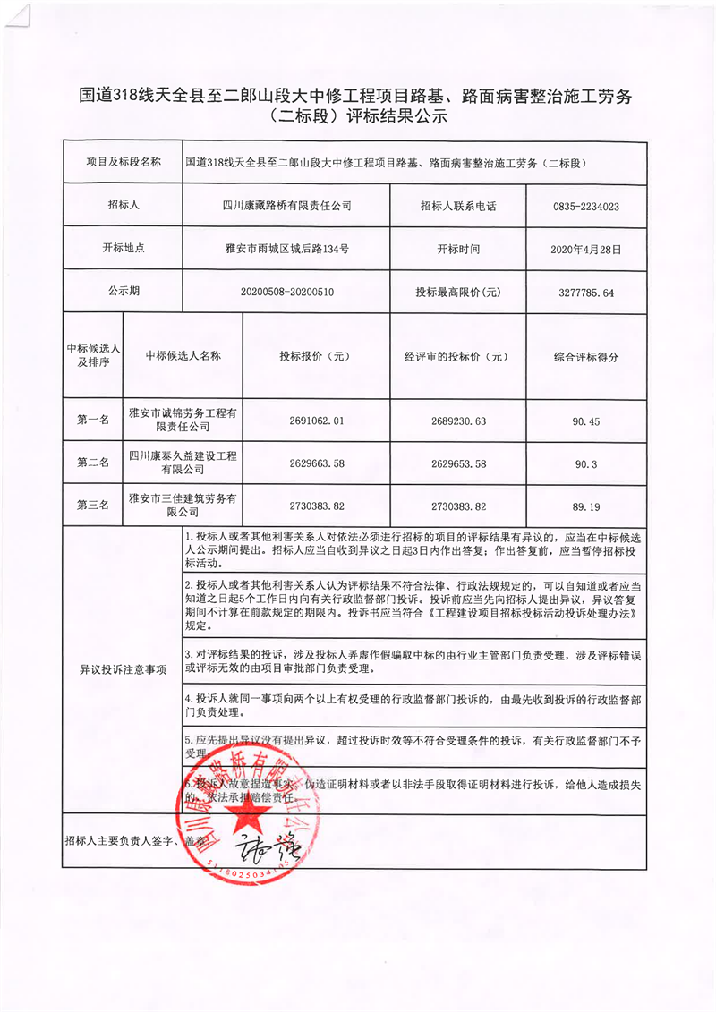四川康藏路橋有限責(zé)任公司國道318線天全縣至二郎山段大中修工程項目路基、路面病害整治施工勞務(wù)(一標(biāo)段)評標(biāo)結(jié)果公示