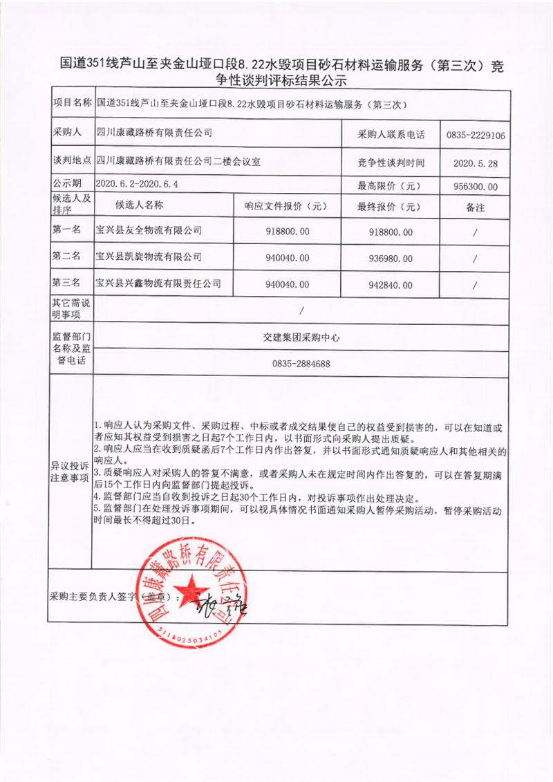四川康藏路橋有限責(zé)任公司國道351線蘆山至夾金山埡口段8.22水毀項(xiàng)目砂石材料運(yùn)輸服務(wù)(第三次)競(jìng)爭(zhēng)性談判評(píng)標(biāo)結(jié)果公示