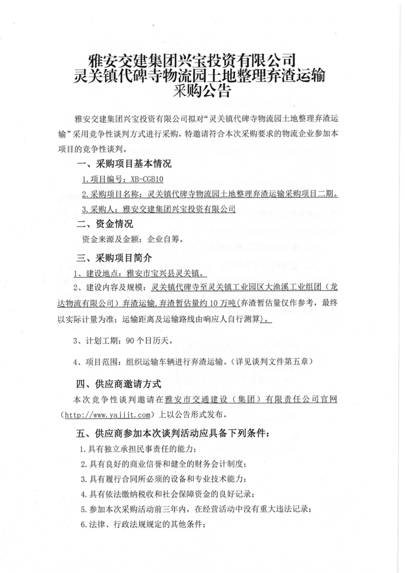 雅安交建集團(tuán)興寶投資有限公司靈關(guān)鎮(zhèn)代碑寺物流園土地整理棄渣運(yùn)輸采購項目二期競爭性談判公告