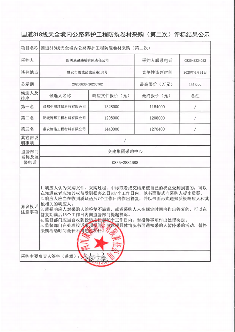 四川康藏路橋有限責(zé)任公司國道318線天全境內(nèi)公路養(yǎng)護工程防裂卷材采購(第二次)評標(biāo)結(jié)果公示