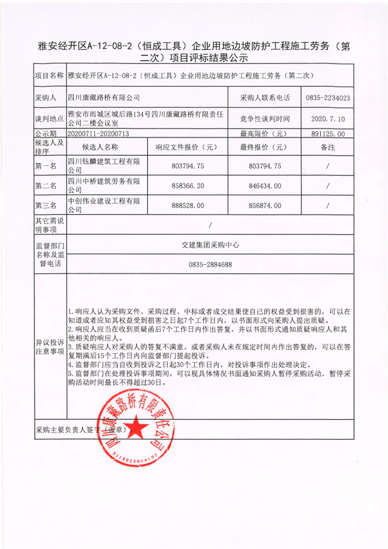 四川康藏路橋有限公司雅安經(jīng)開區(qū)A-12-08-2(恒成工具)企業(yè)用地邊坡防護(hù)工程施工勞務(wù)(第二次)項(xiàng)目評標(biāo)結(jié)果公示