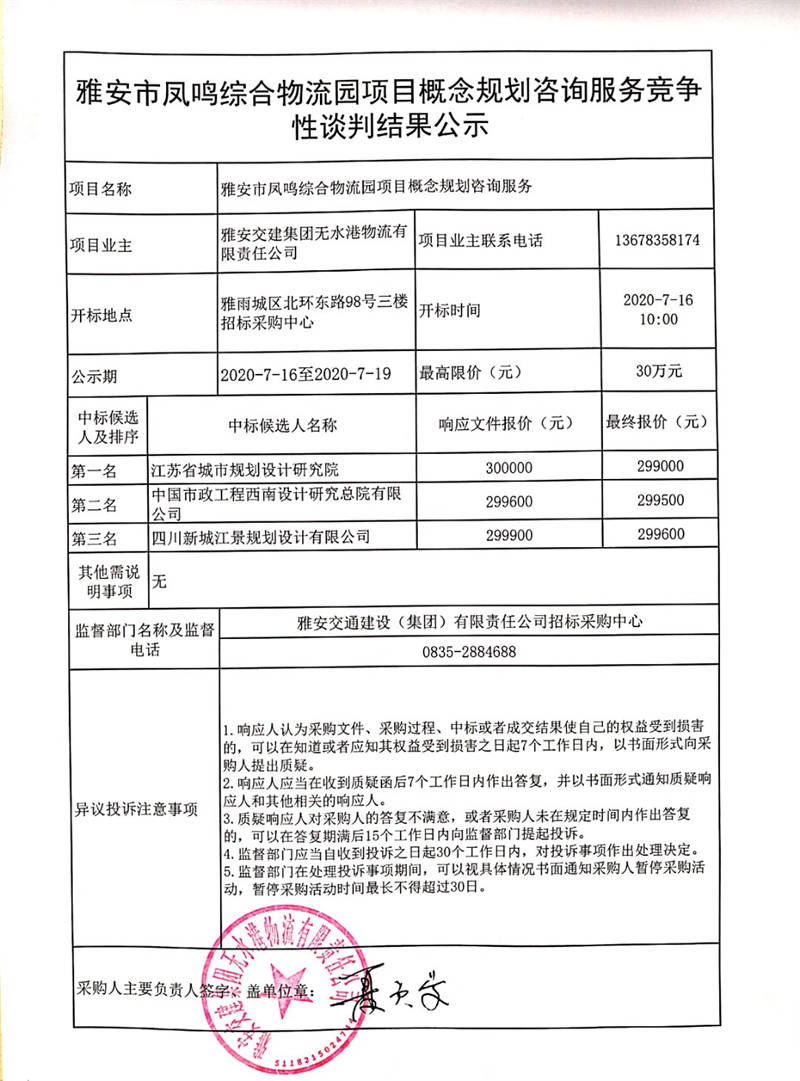雅安交建集團無水港物流有限責任公司雅安市鳳鳴綜合物流園項目概念規(guī)劃咨詢服務(wù)競爭性談判結(jié)果公示