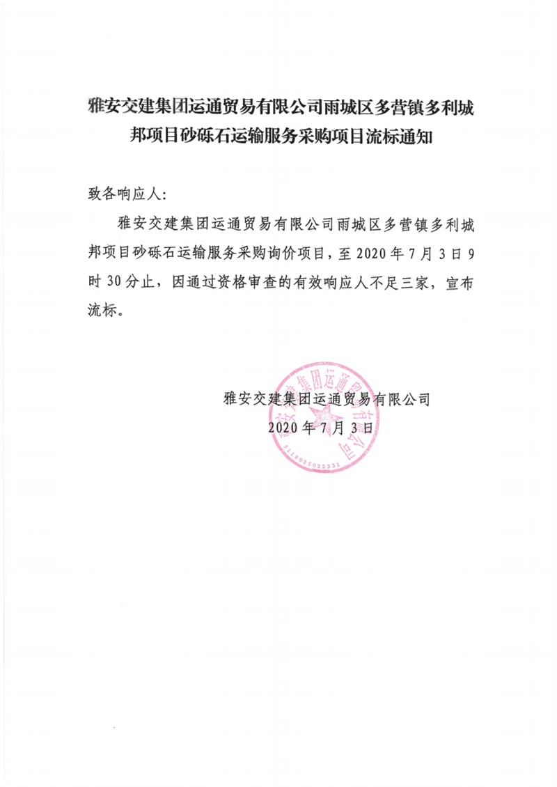 雅安交建集團運通貿(mào)易有限公司雨城區(qū)多營鎮(zhèn)多利城邦項目砂礫石運輸服務(wù)采購項目流標通知