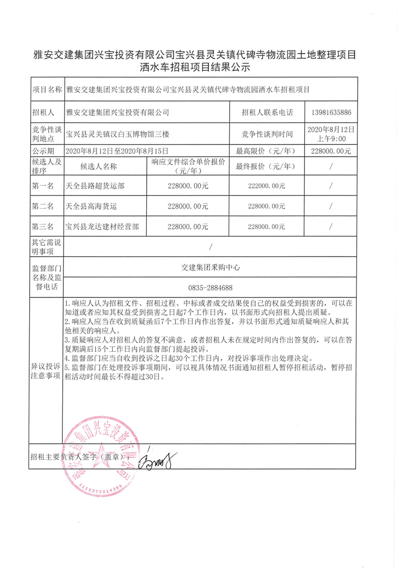 雅安交建集團興寶投資有限公司寶興縣靈關鎮(zhèn)代碑寺物流園灑水車招租項目結果公示