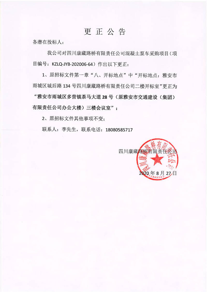 四川康藏路橋有限責(zé)任公司混凝土泵車(chē)采購(gòu)項(xiàng)目更正公告