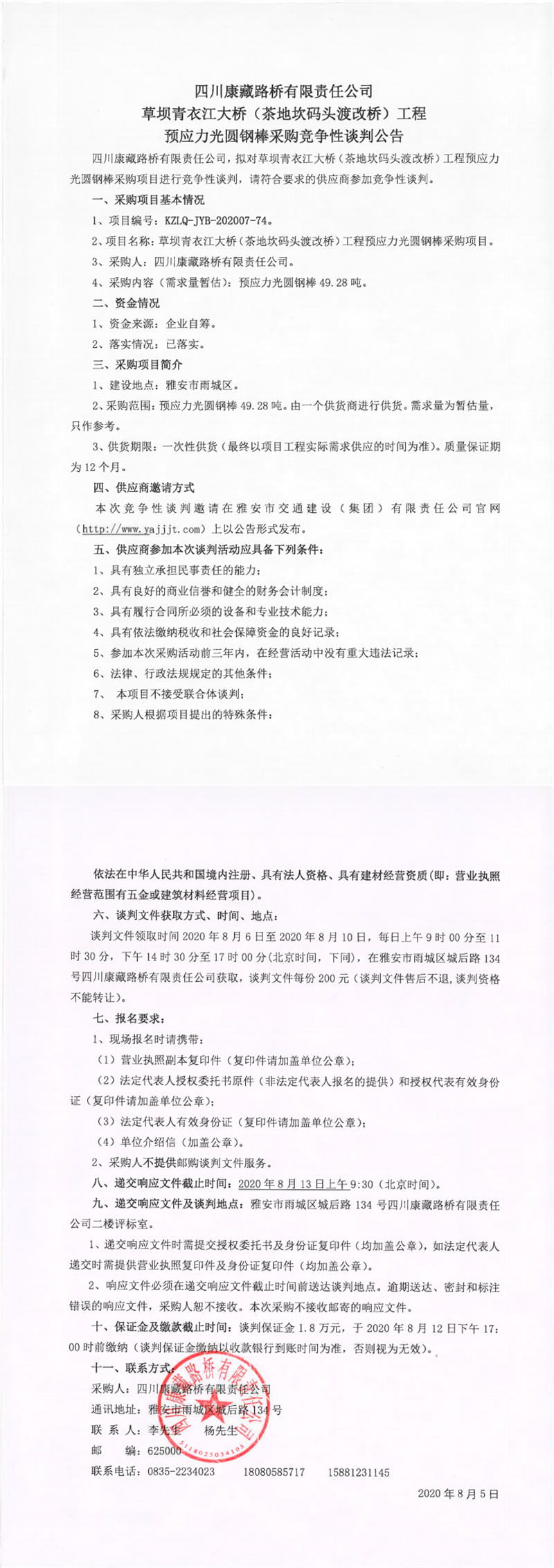 四川康藏路橋有限責任公司草壩青衣江大橋(茶地坎碼頭渡改橋)工程預應力光圓鋼棒采購競爭性談判公告