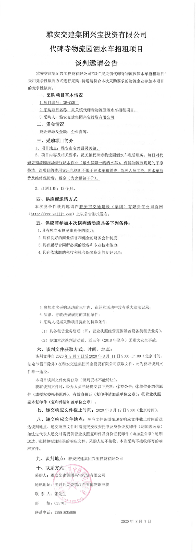 雅安交建集團(tuán)興寶投資有限公司代碑寺物流園灑水車(chē)招租項(xiàng)目談判邀請(qǐng)公告