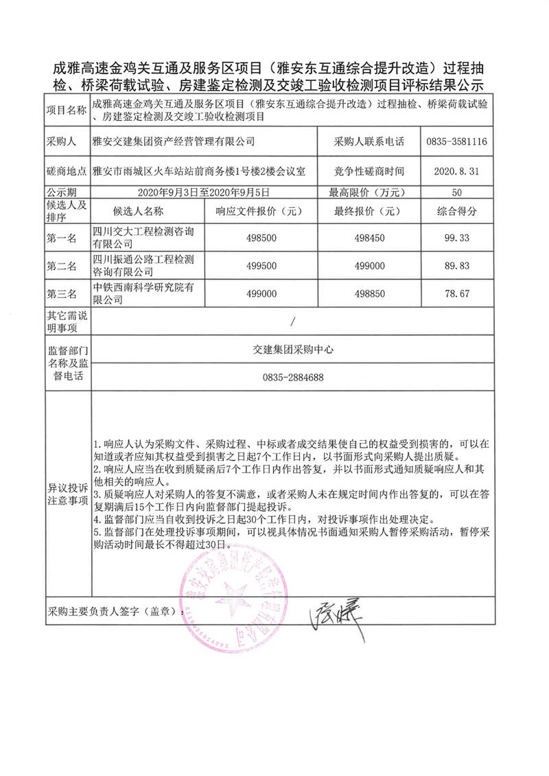 雅安交建集團(tuán)資產(chǎn)經(jīng)營(yíng)管理有限公司成雅高速金雞關(guān)互通及服務(wù)區(qū)項(xiàng)目(雅安東互通綜合提升改造)過(guò)程抽檢、橋梁荷載試驗(yàn)、房建鑒定檢測(cè)及交竣工驗(yàn)收檢測(cè)項(xiàng)目評(píng)標(biāo)結(jié)果公示