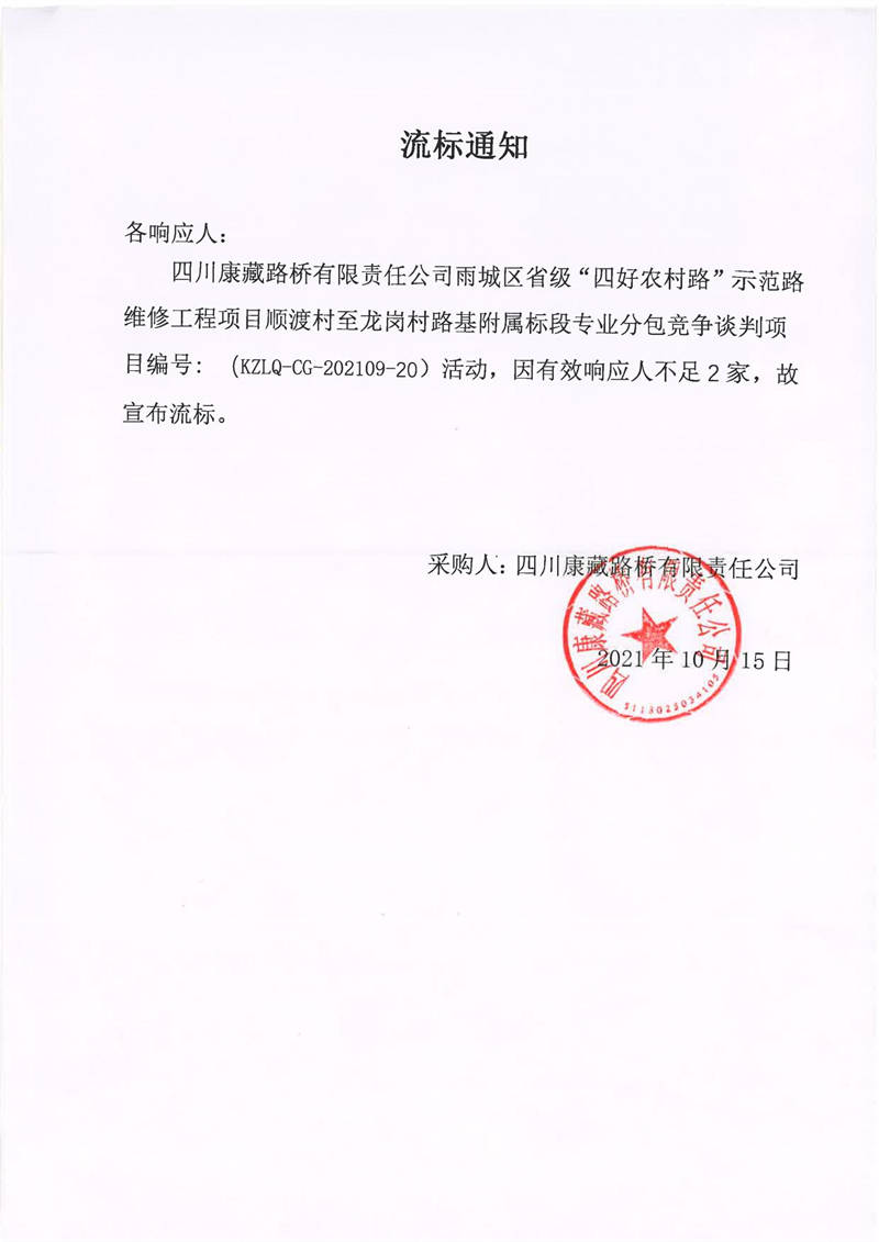 四川康藏路橋有限責(zé)任公司雨城區(qū)省級“四好農(nóng)村路”示范路維修工程項(xiàng)目順渡村至龍崗村路基附屬標(biāo)段專業(yè)分包流標(biāo)通知