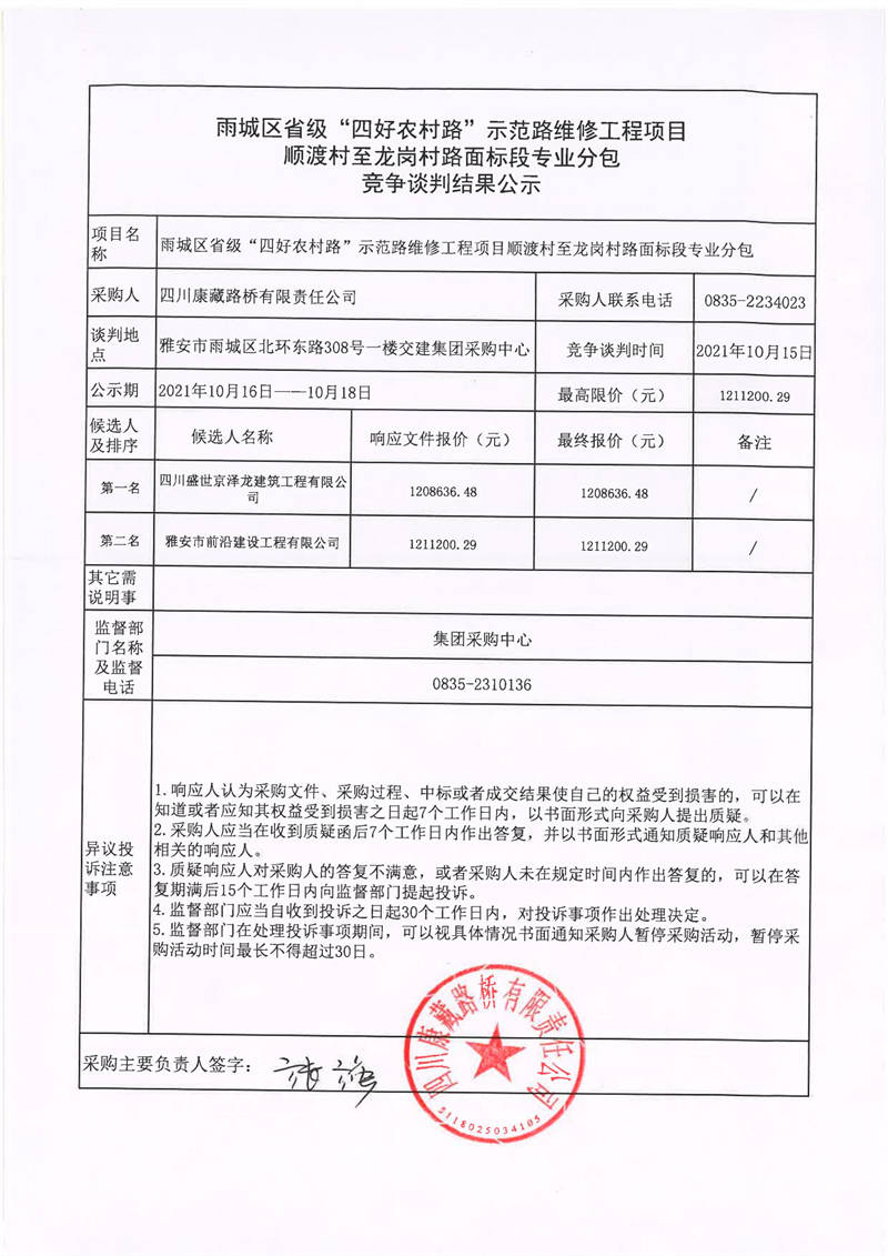 四川康藏路橋有限責(zé)任公司雨城區(qū)省級“四好農(nóng)村路”示范路維修工程項目順渡村至龍崗村路面標段專業(yè)分包競爭談判結(jié)果公示
