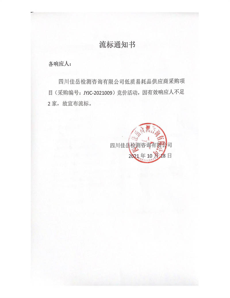四川佳岳檢測(cè)咨詢有限公司低質(zhì)易耗品供應(yīng)商采購項(xiàng)目流標(biāo)通知