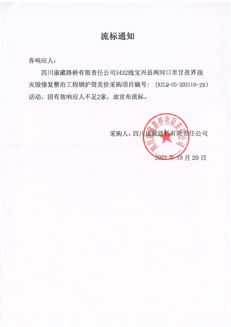 四川康藏路橋有限責任公司S432線寶興縣兩河口至甘孜界段災(zāi)毀修復(fù)整治工程鋼護筒競價采購流標通知