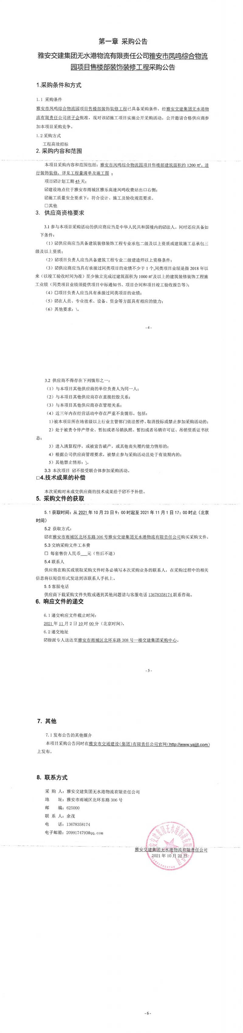 雅安交建集團(tuán)無水港物流有限責(zé)任公司雅安市鳳鳴綜合物流園項目售樓部裝飾裝修工程采購公告