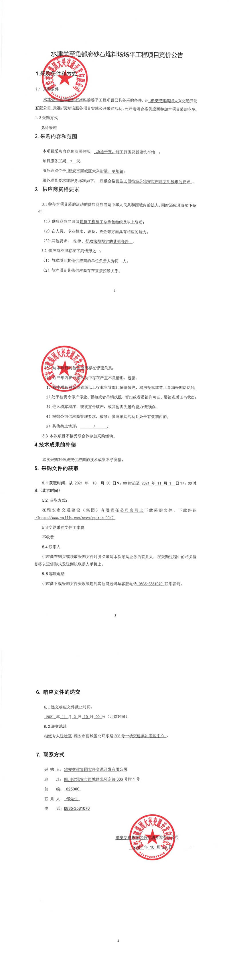 雅安交建集團大興交通開發(fā)有限公司水津關(guān)至龜都府砂石堆料場場平工程項目競價公告