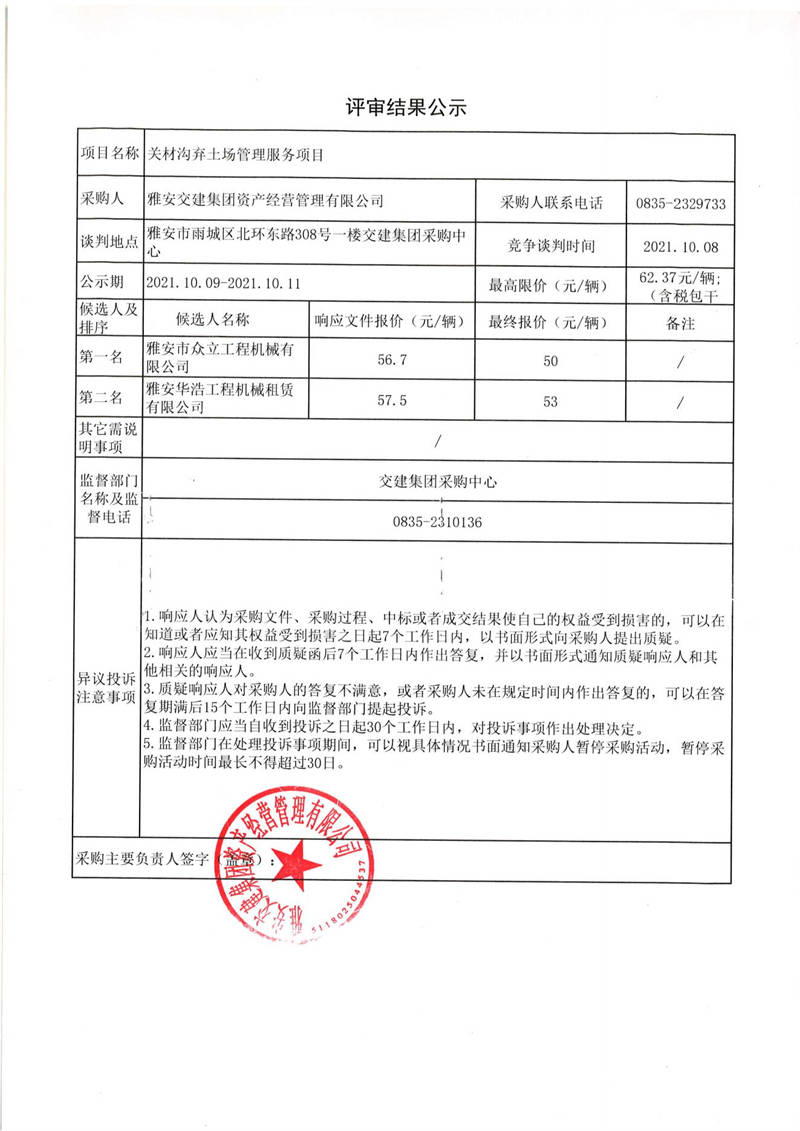 雅安交建集團(tuán)資產(chǎn)經(jīng)營管理有限公司關(guān)材溝棄土場管理服務(wù)項目評審結(jié)果公示