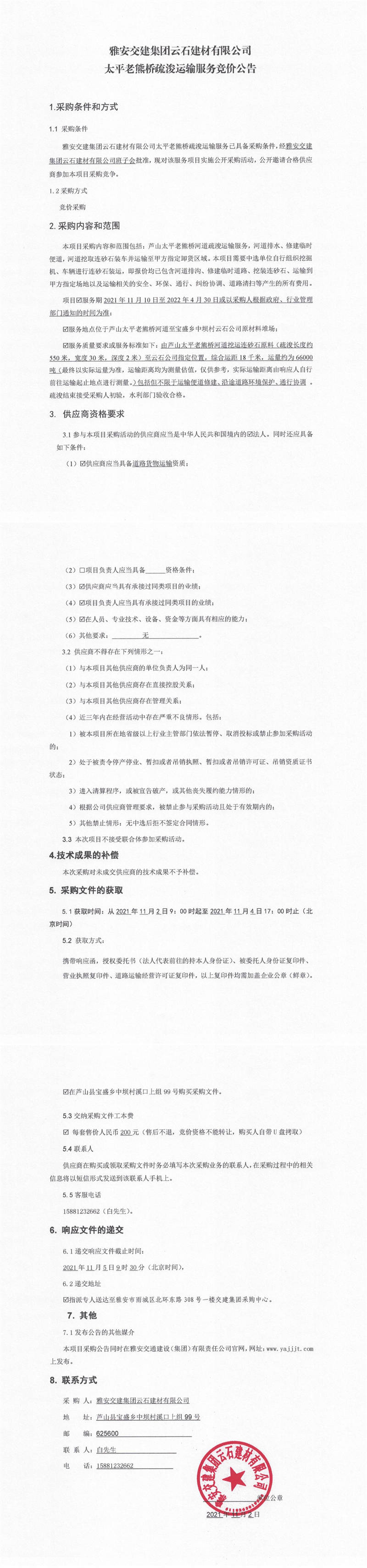 雅安交建集團云石建材有限公司太平老熊橋疏浚運輸服務(wù)競價公告