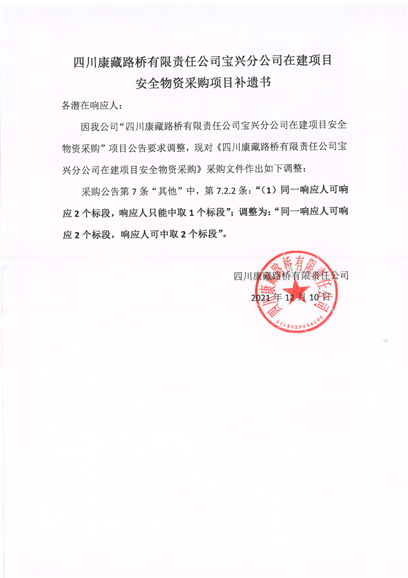 四川康藏路橋有限責(zé)任公司寶興分公司在建項(xiàng)目安全物資采購(gòu)項(xiàng)目補(bǔ)遺書(shū)