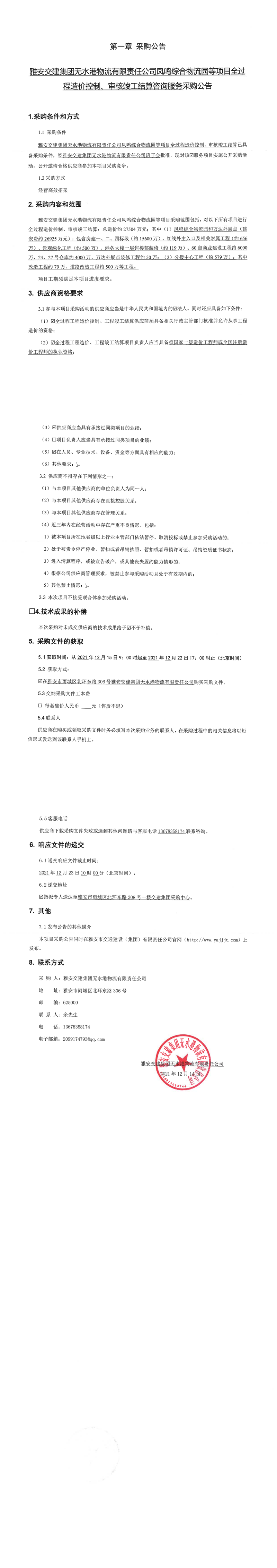雅安交建集團無水港物流有限責任公司鳳鳴綜合物流等項目全過程造價控制、審核竣工結算咨詢服務采購公告