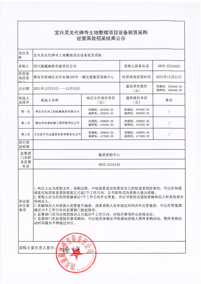 四川康藏路橋有限責(zé)任公司寶興靈關(guān)代碑寺土地整理項目設(shè)備租賃采購經(jīng)營高效招采結(jié)果公示
