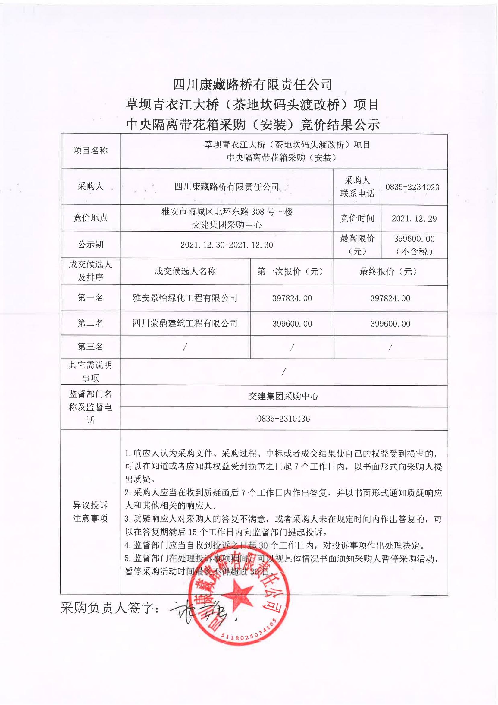 四川康藏路橋有限責(zé)任公司草壩青衣江大橋(茶地坎碼頭渡改橋)項(xiàng)目中央隔離帶花箱采購(安裝)競(jìng)價(jià)結(jié)果公示