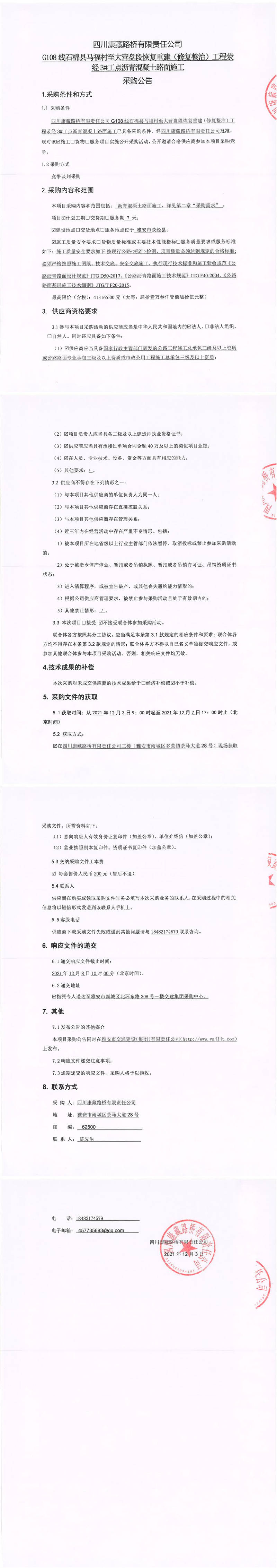 四川康藏路橋有限責任公司G108線石棉縣馬福村至大營盤段恢復重建(修復整治)工程滎經3#工點瀝青混凝土路面施工采購公告