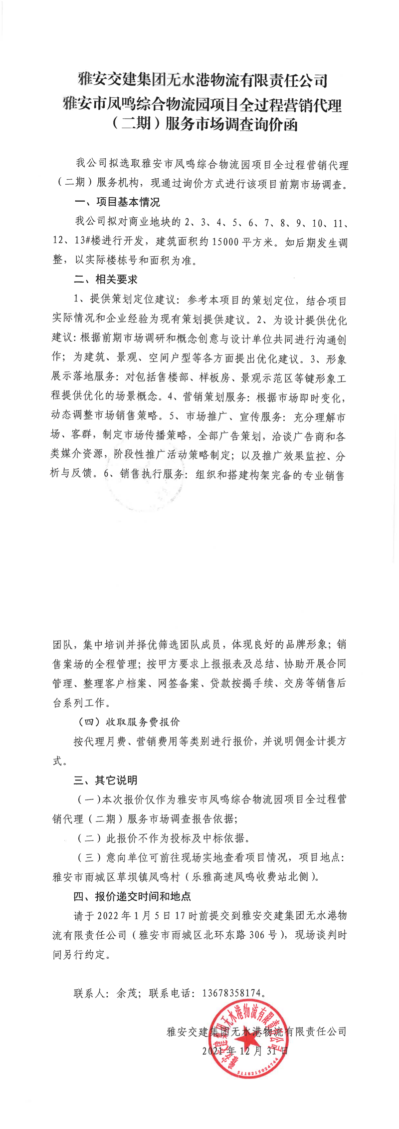 雅安交建集團(tuán)無水港物流有限責(zé)任公司雅安市鳳鳴綜合物流園項(xiàng)目全過程營銷代理(二期)服務(wù)市場調(diào)查詢價(jià)函