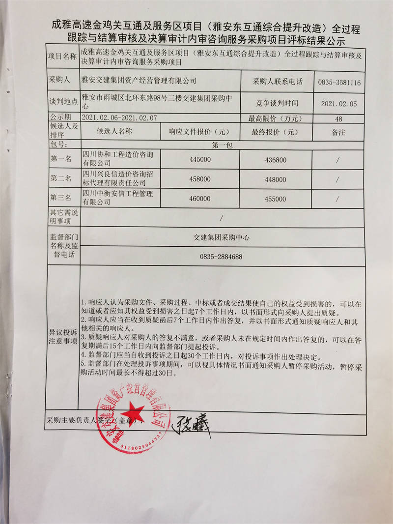 雅安交建集團資產(chǎn)經(jīng)營管理有限公司成雅高速金雞關(guān)互通及服務(wù)區(qū)項目(雅安東互通綜合提升改造)全過程跟蹤與結(jié)算審核及決算審計內(nèi)審咨詢服務(wù)評標(biāo)結(jié)果公示