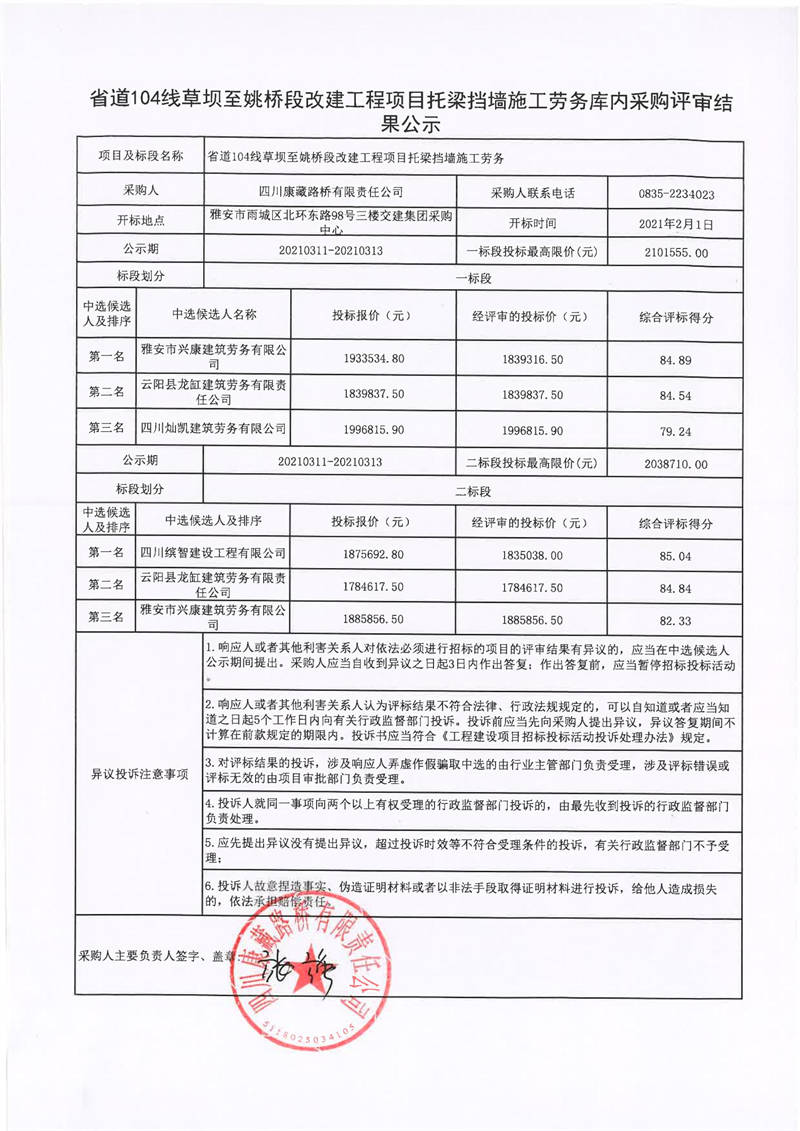 四川康藏路橋有限責任公司省道104線草壩至姚橋段改建工程項目托梁擋墻施工勞務庫內(nèi)采購評審結(jié)果公示