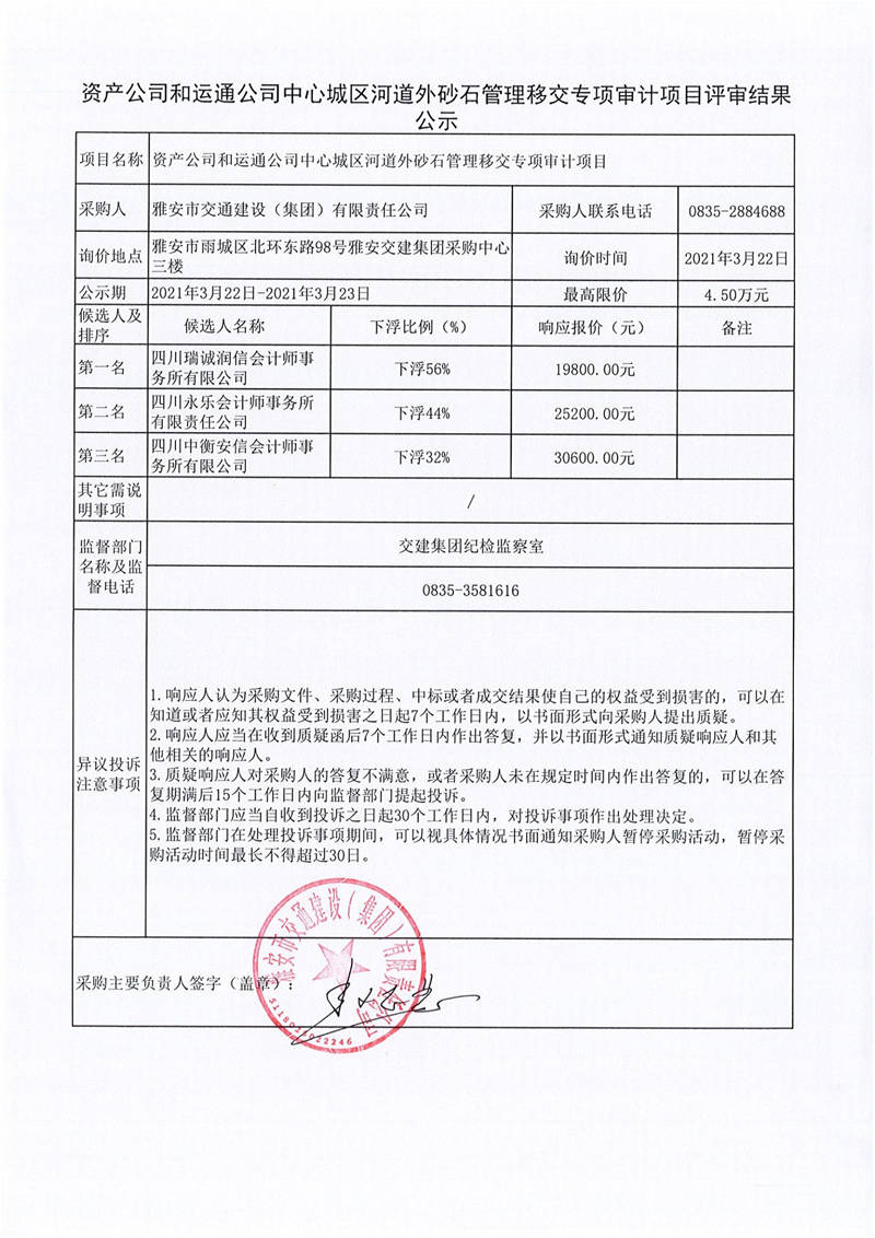 雅安市交通建設(shè)(集團(tuán))有限責(zé)任公司資產(chǎn)公司和運(yùn)通公司中心城區(qū)河道外砂石管理移交專項(xiàng)審計項(xiàng)目評審結(jié)果公示