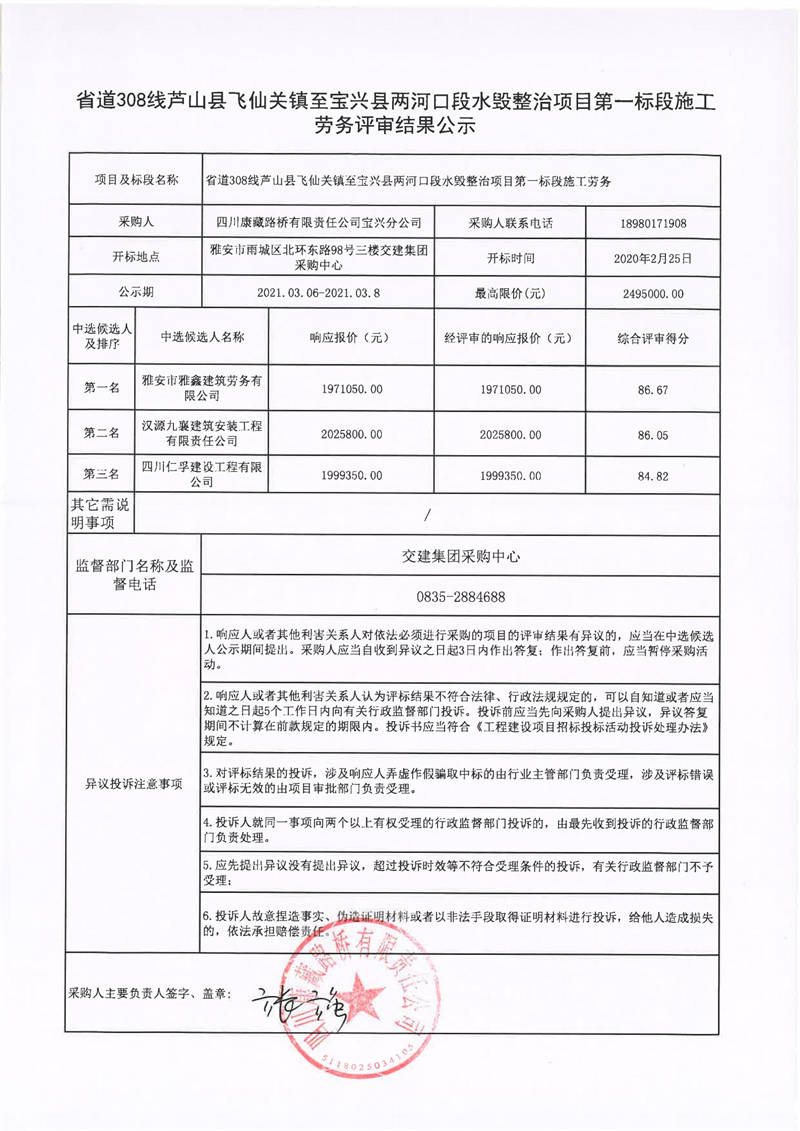 四川康藏路橋有限責任公司寶興分公司省道308線蘆山縣飛仙關鎮(zhèn)至寶興縣兩河口段水毀整治項目第一標段施工勞務評審結(jié)果公示