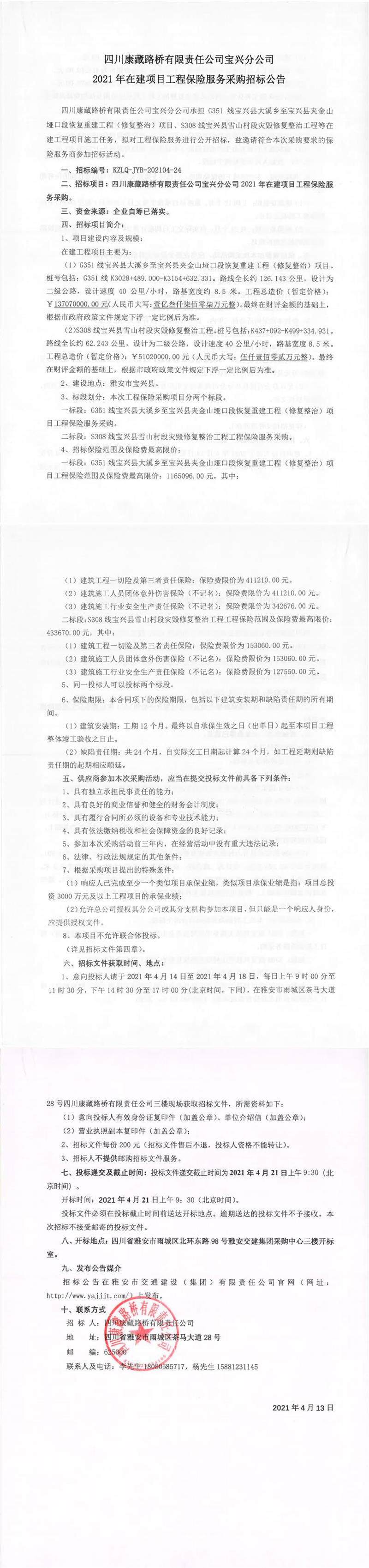 四川康藏路橋有限責(zé)任公司寶興分公司2021年在建項目工程保險服務(wù)采購招標(biāo)公告