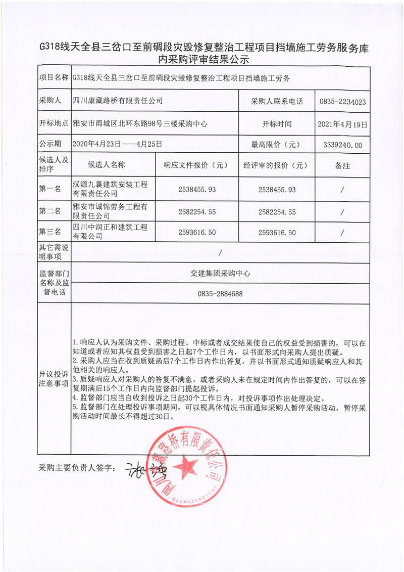 四川康藏路橋有限責(zé)任公司G318線天全縣三岔口至前碉段災(zāi)毀修復(fù)整治工程項(xiàng)目擋墻施工勞務(wù)服務(wù)庫(kù)內(nèi)采購(gòu)評(píng)審結(jié)果公示