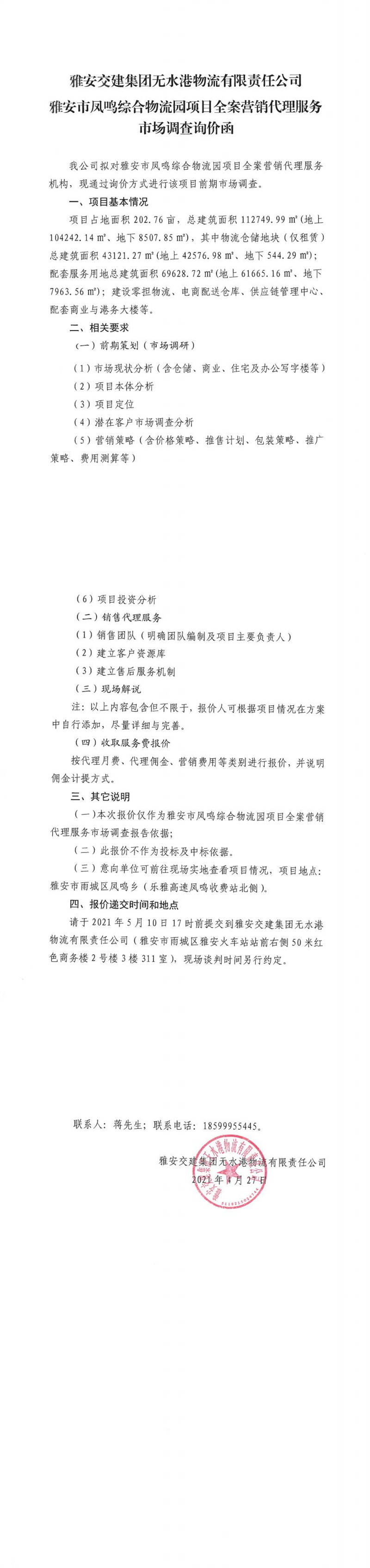 雅安交建集團無水港物流有限責任公司雅安市鳳鳴綜合物流園項目全案營銷代理服務(wù)市場調(diào)查詢價函