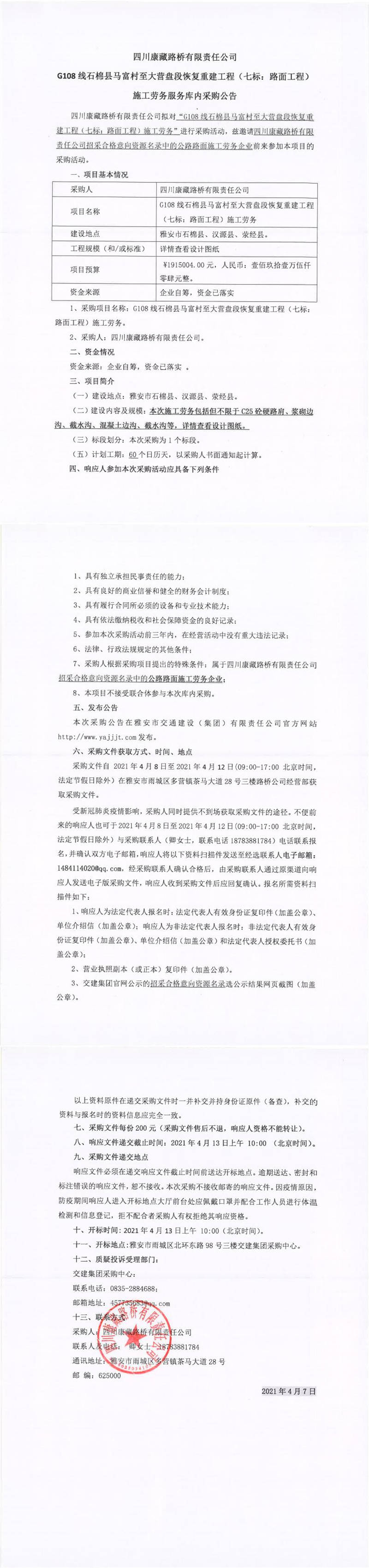 四川康藏路橋有限責(zé)任公司G108線(xiàn)石棉縣馬富村至大營(yíng)盤(pán)段恢復(fù)重建工程(七標(biāo):路面工程)施工勞務(wù)服務(wù)庫(kù)內(nèi)采購(gòu)公告