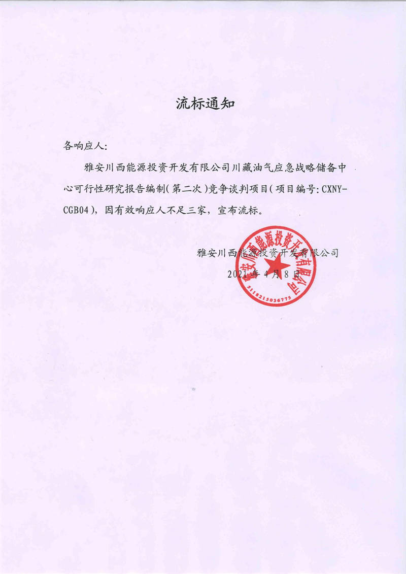 雅安川西能源投資開發(fā)有限公司川藏油氣應(yīng)急戰(zhàn)略儲(chǔ)備中心可行性研究報(bào)告編制(第二次)競(jìng)爭(zhēng)談判項(xiàng)目流標(biāo)通知