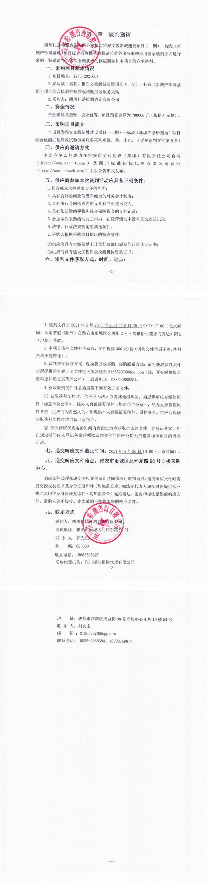 四川佳岳檢測咨詢有限公司雅安文教新城建設項目(一期)一標段(新城產(chǎn)學研基地)項目綜合檢測樁基靜載試驗勞務服務競爭談判公告