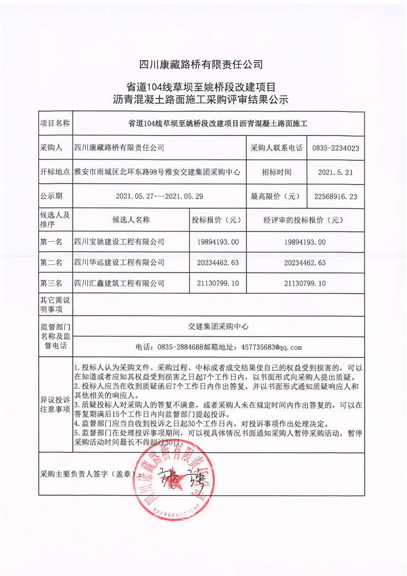 四川康藏路橋有限責(zé)任公司省道104線草壩至姚橋改建項(xiàng)目瀝青混凝土路面施工采購評(píng)審結(jié)果公示