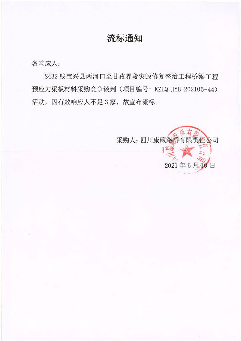 四川康藏路橋有限責(zé)任公司S432線寶興縣兩河口至甘孜界段災(zāi)毀修復(fù)整治工程橋梁工程預(yù)應(yīng)力梁板材料采購競爭談判流標(biāo)通知