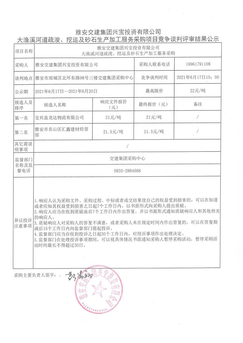 雅安交建集團(tuán)興寶投資有限公司大漁溪河道疏浚、挖運(yùn)及砂石生產(chǎn)加工服務(wù)采購項(xiàng)目競爭談判評(píng)審結(jié)果公示