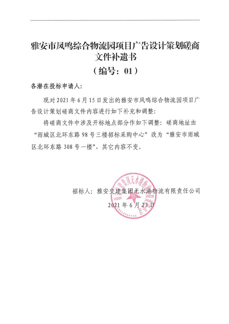 雅安交建集團(tuán)無水港物流有限責(zé)任公司雅安市鳳鳴綜合物流園項目廣告設(shè)計策劃磋商文件補遺書