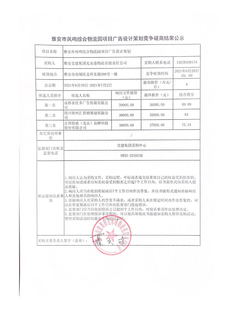 雅安交建集團(tuán)無水港物流有限責(zé)任公司雅安市鳳鳴綜合物流園項(xiàng)目廣告設(shè)計(jì)策劃競爭磋商結(jié)果公示