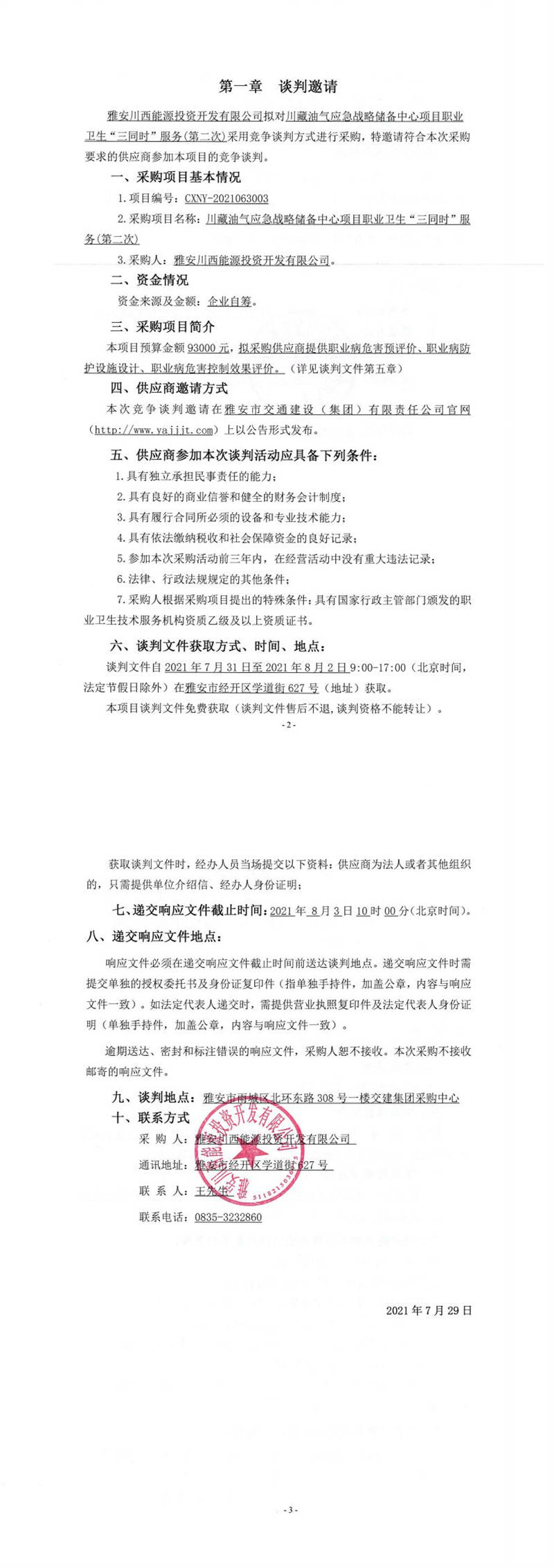 雅安川西能源投資開發(fā)有限公司川藏油氣應(yīng)急戰(zhàn)略儲(chǔ)備中心項(xiàng)目職業(yè)衛(wèi)生“三同時(shí)”服務(wù)(第二次)競(jìng)爭(zhēng)談判公告