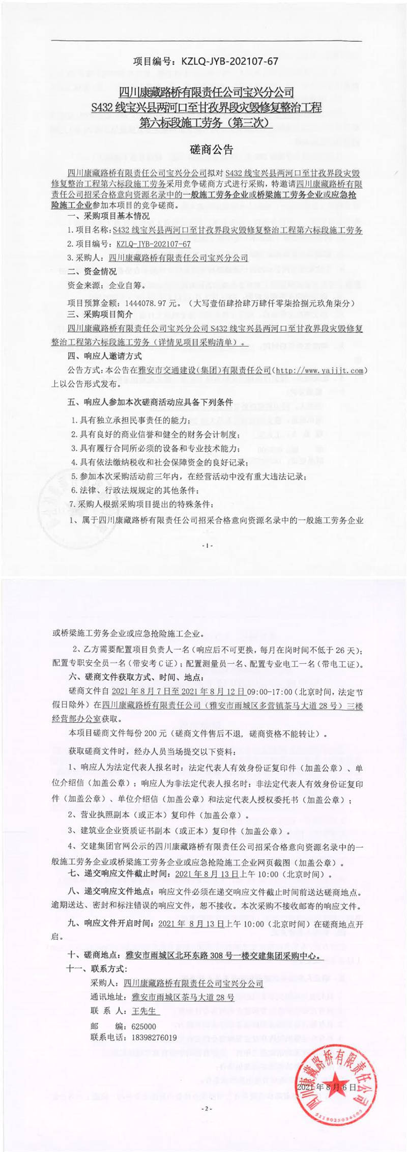 四川康藏路橋有限責(zé)任公司寶興分公司S432線(xiàn)寶興縣兩河口至甘孜界段災(zāi)毀修復(fù)整治工程第六標(biāo)段施工勞務(wù)(第三次)競(jìng)爭(zhēng)磋商公告