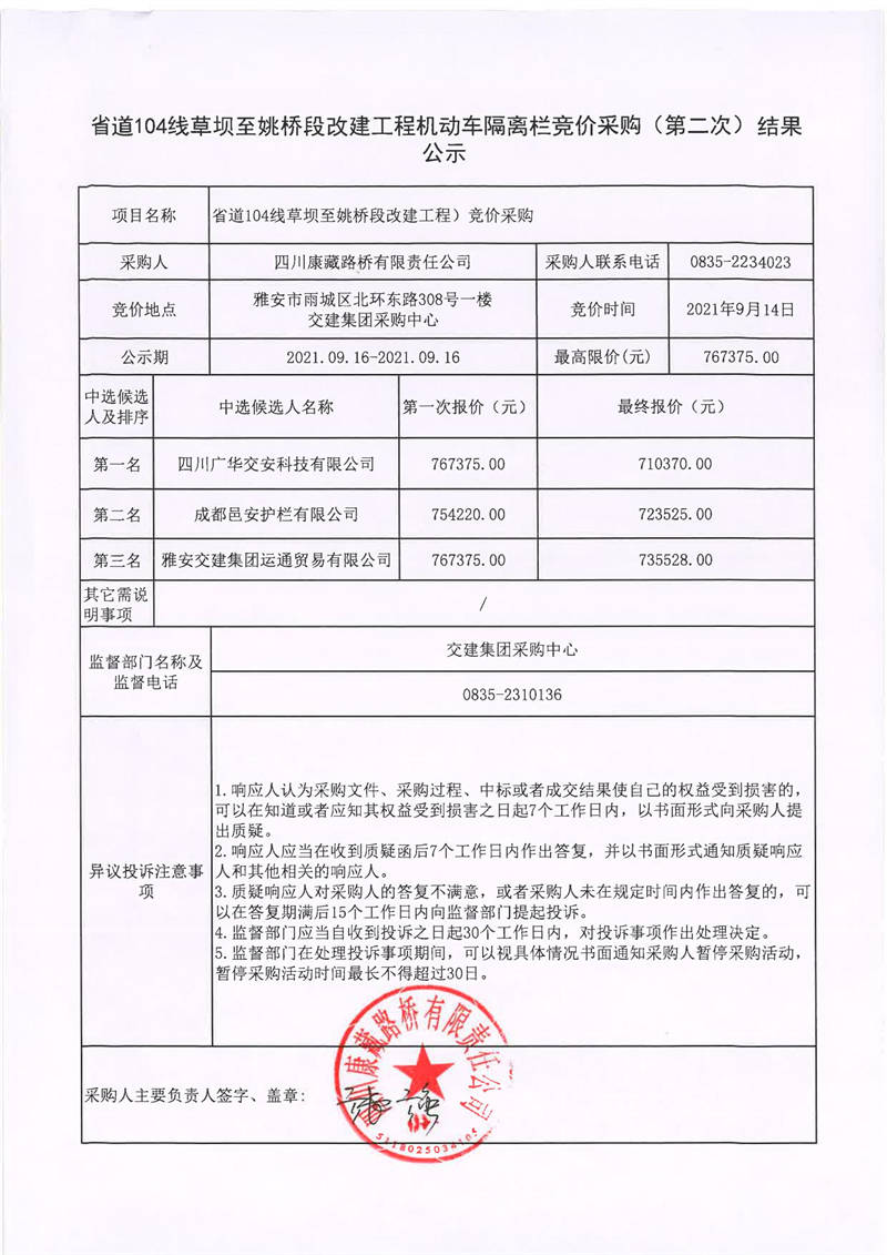 四川康藏路橋有限責(zé)任公司省道104線草壩至姚橋段改建工程機(jī)動(dòng)車隔離欄競(jìng)價(jià)采購(第二次)結(jié)果公示