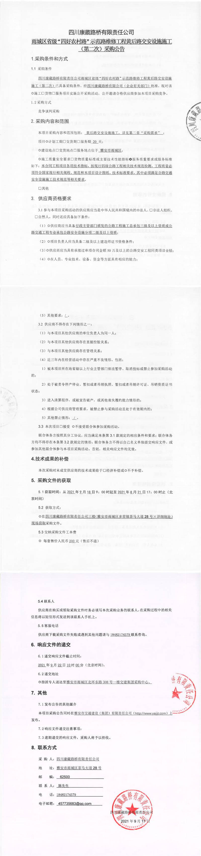 四川康藏路橋有限責任公司雨城區(qū)省級“四好農村路”示范路維修工程黃后路交安設施施工(第二次)采購公告