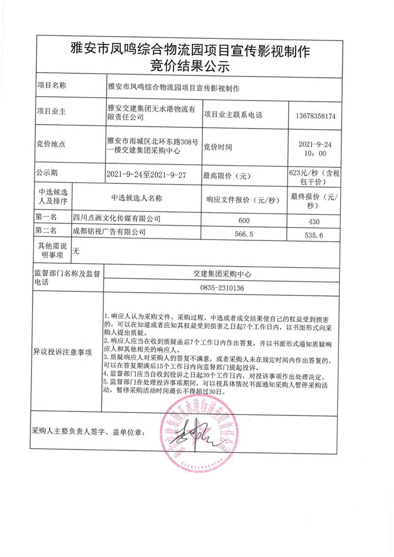 雅安交建集團無水港物流有限責任公司雅安市鳳鳴綜合物流園項目宣傳影視制作競價結(jié)果公示