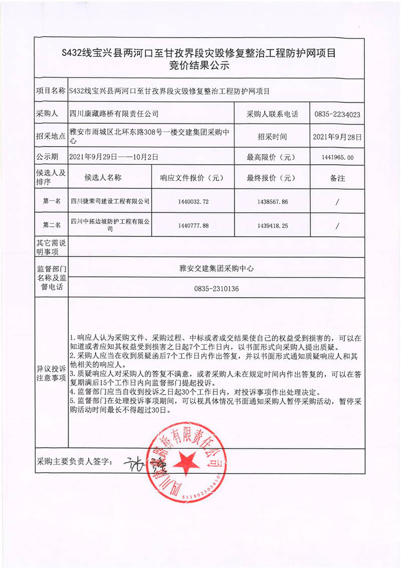 四川康藏路橋有限責(zé)任公司S432線寶興縣兩河口至甘孜界段災(zāi)毀修復(fù)整治工程防護(hù)網(wǎng)項(xiàng)目競價結(jié)果公示