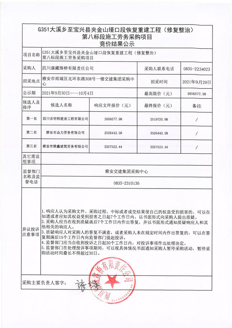四川康藏路橋有限責任公司G351大溪鄉(xiāng)至寶興縣夾金山埡口段恢復重建工程(修復整治)第八標段施工勞務采購項目競價結(jié)果公示