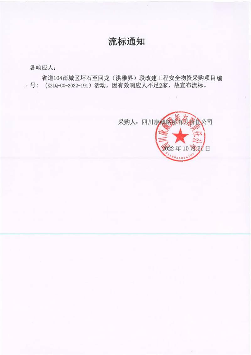 四川康藏路橋有限責(zé)任公司省道104雨城區(qū)坪石至回龍(洪雅界)段改建工程項目安全物資采購項目流標通知